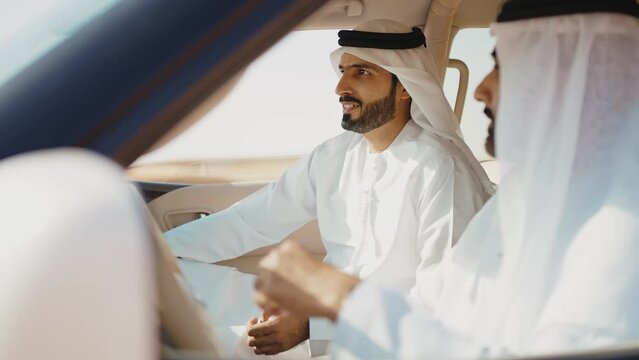 Two friends making the safari in the Dubai desert. Locals with kandura white outfit spending time together with the 4x4 car on the dunes in sharjah. Concept about traveling in the united arab emirates