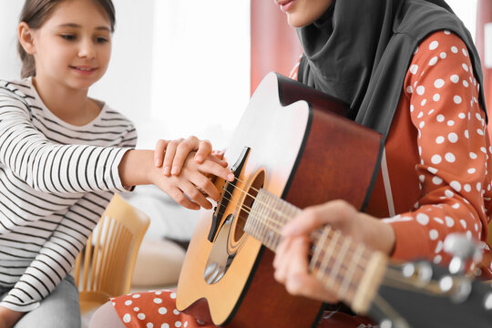 Teacher helping  female student with hijab during lesson