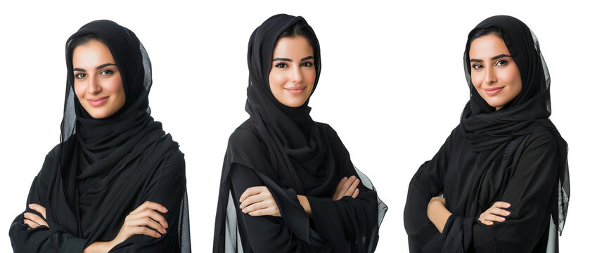 Smiling beauty Arab women in black hijab standing arms crossed, stylish modern Muslim models isolated on transparent background