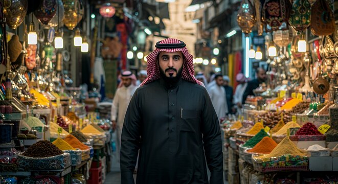 Arabian Man Browses Intricate Lanterns in a Vibrant Souk