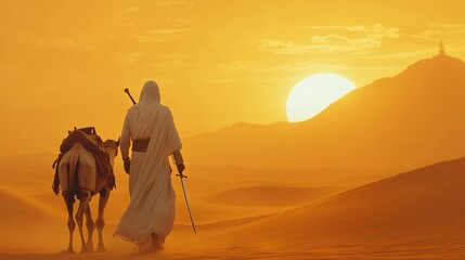 Wallpaper of an Arabian knight on a sunset journey through the desert, with a camel and soft, illuminated sands