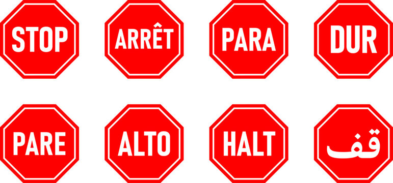 Set of Octagonal Red and White Stop Signs in Various Languages including English, French, Spanish, Portuguese, German, Turkish and Arabic. Vector Image.