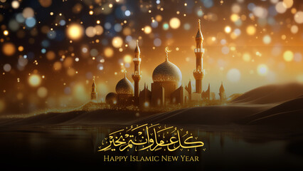 Happy Islamic New Year greeting design with arabic calligraphy, a beautiful and charming mosque, river and light as a background