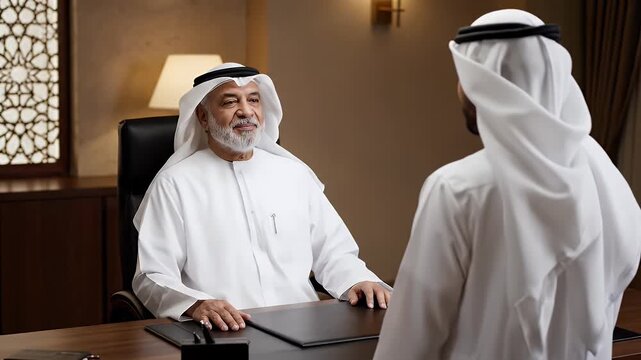 Two men in traditional Arabic attire are in a room having a discussion, a wooden desk is in front