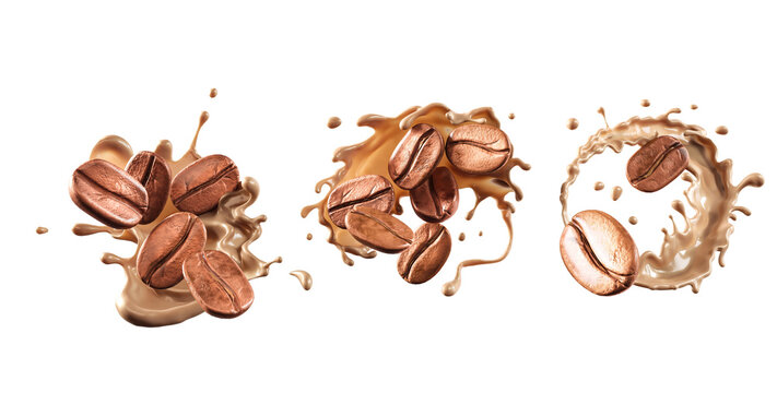 Set of Milk coffee splash Icon with Coffee Bean falling, 3d illustration.