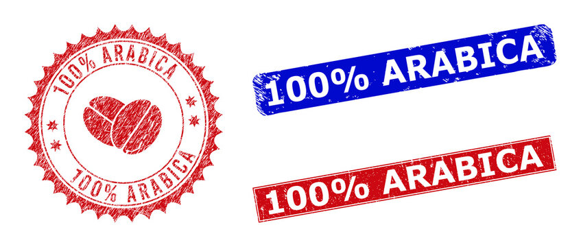 100 arabica icon. 100 robusta label. 100 liberica symbol. Premium coffee blend vector illustration. Coffee beans emblem, badge, sign, stamp or seal for product packaging.