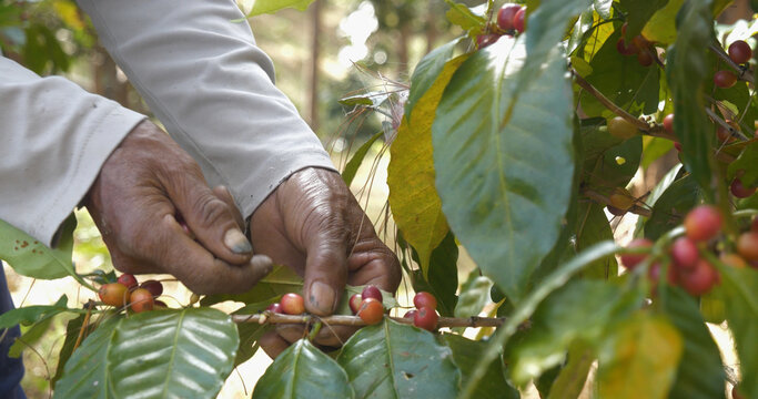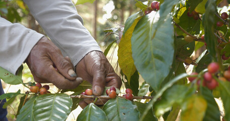 Harvesting arabica and robusta coffee berries in agriculture   farmer picking coffee berries by hand