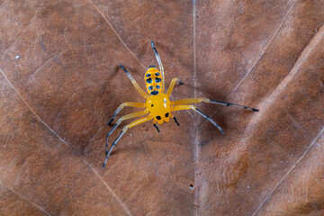 An aesthetically pleasing and eye-catching photograph of a spider against a background dominated by warm colors. The spider species is a jumping spider. Natural background.