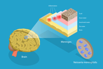 3D Isometric Flat Vector Conceptual Illustration of Meningitis, Human Brain and Meningococcal Bacteria