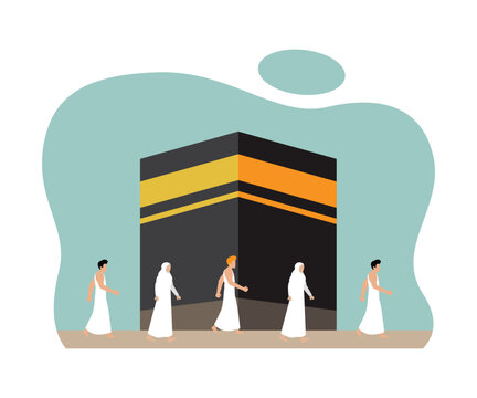 Muslim people doing Islamic hajj pilgrimage to Kabah flat 2d vector illustration