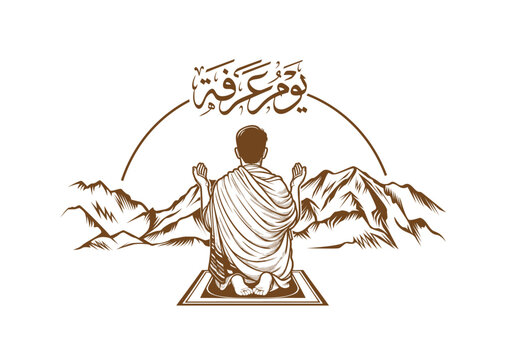 Translation Arafa Day in Arabic handwritten calligraphy vector illustration for a man praying in haj on arafa mountain adha eid greetings design symbol