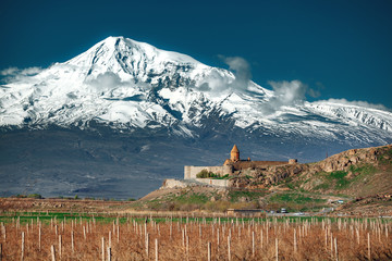 Ancient Armenian church Khor Virap with Ararat, Armenia. Panorama