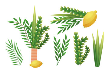 Four species for Jewish Holiday Sukkot: palm branch, willow, myrtle leaves and etrog. Hebrew text "Happy Sukkot". Icons set. Vector illustration. Isolated on white.