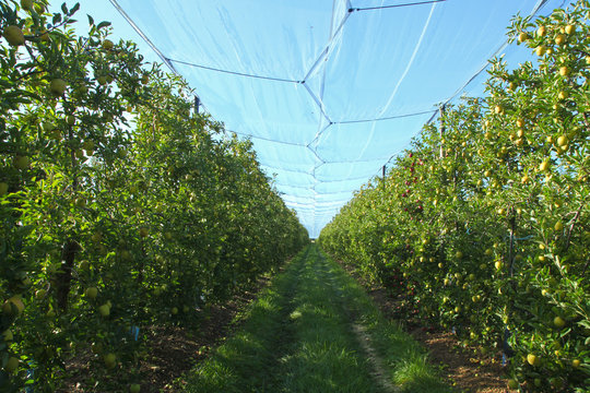 Filet anti-grêle d'une plantation de pommiers