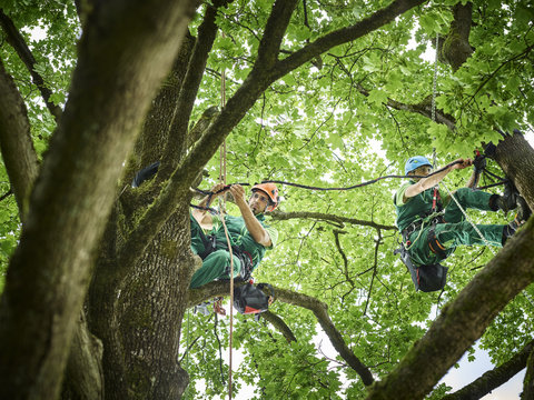 Tree cutters hanging on ropes in tree