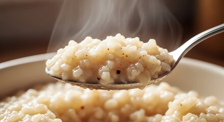 Steaming bowl of creamy arborio rice pudding with spoonful