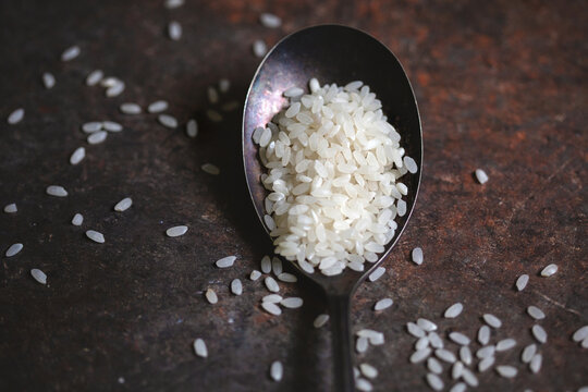 Top View of a  Spoon of Uncooked Arborio Rice on Dark Background