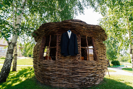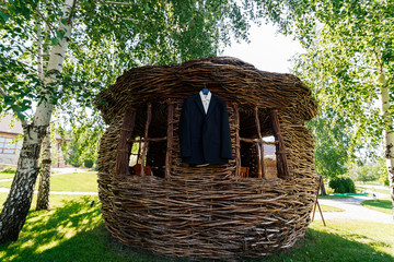 A scarecrow sitting on a wooden chair in front of a small garden gazebo on an allotment, cleverly imitating a resting human figure, basking peacefully in the warm sunlight of a golden autumn day.