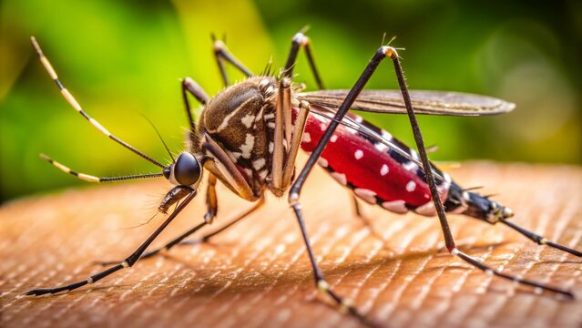 Aedes mosquito on human skin, magnified, highlighting disease transmission, with shallow focus on surrounding skin tone, conveying risk of dengue fever infection.
