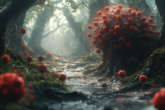 Microscopic view of a spherical virus with spike proteins, highly detailed with intricate textures