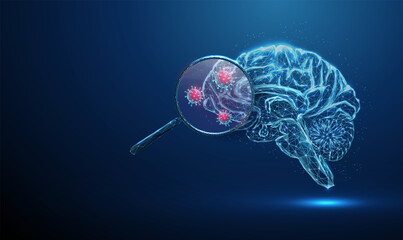 3d brain with magnifying glass and red viruses inside Viral brain infection, targeted antiviral therapy, precision medicine, immunotherapy concept