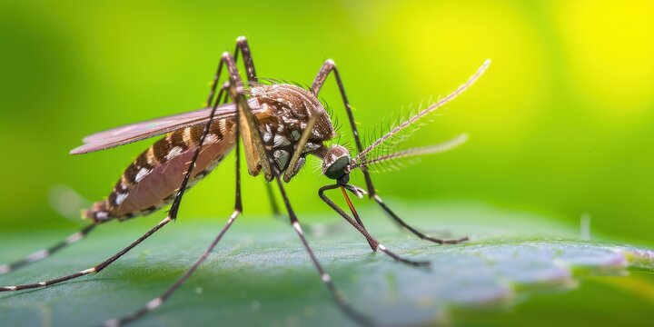 A mosquito Aedes Aegypti on a yellow fever virus. 3D mosquito flavivirus, tropical disease spread, illness risk, prevention, endemic area. Medicine science, healthcare, infection epidemic, vaccination