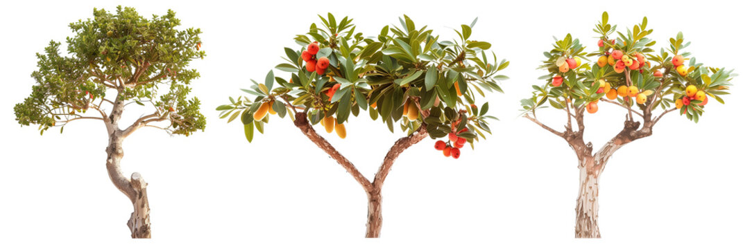 set of arbutus trees, with peeling bark and vibrant fruits, isolated on transparent backgroun
