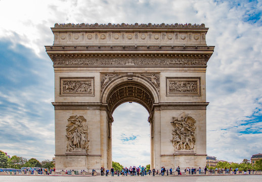 Famous Arc de Triomphe against nice blue sky Arc de Triomphe monument at at the western end of the Champs-elysees road in Paris, France