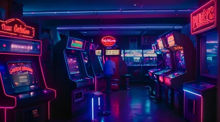 Neon-Lit Retro Arcade: Gamers Amidst Vibrant Contrasts