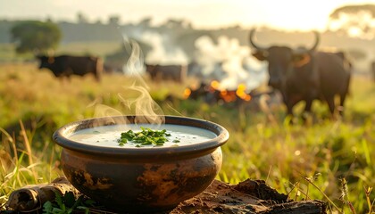 Steaming bowl of soup on a rustic log in a serene grassy field with cattle grazing in the background at sunrise