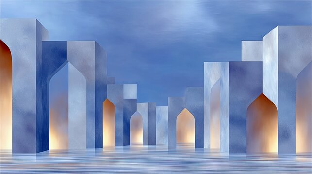 A long corridor with arched ceilings and glowing lights, creating a sense of depth and reflection. The architectural design features a minimalist aesthetic.