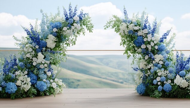 White folding chairs on a seaside wooden deck with a wedding arch.