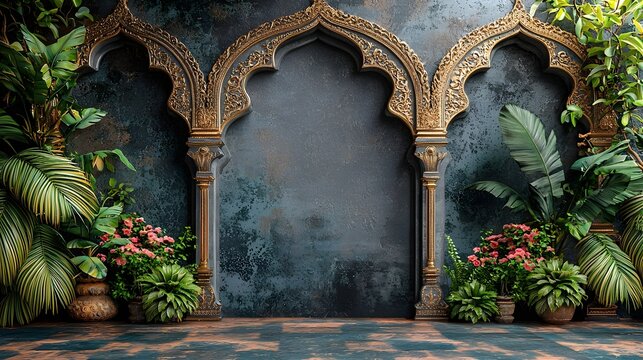 Islamic frame with arch and ornament. Ramadan gate on geometric background for wedding invitation design. Vector oriental decorations set.