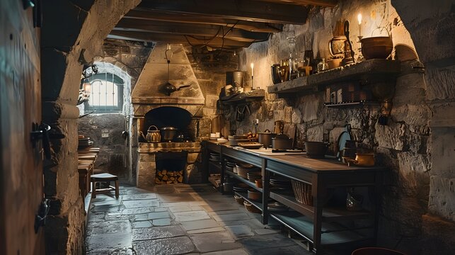 A rustic medieval kitchen with stone walls and vintage cooking utensils illuminated by natural light from a window.
