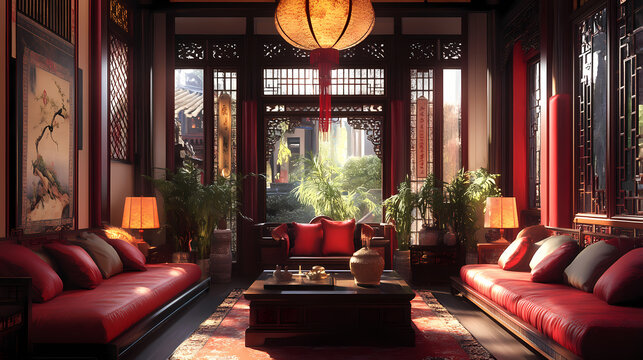 Chinese interior design with red accents. Archaic. Illustration