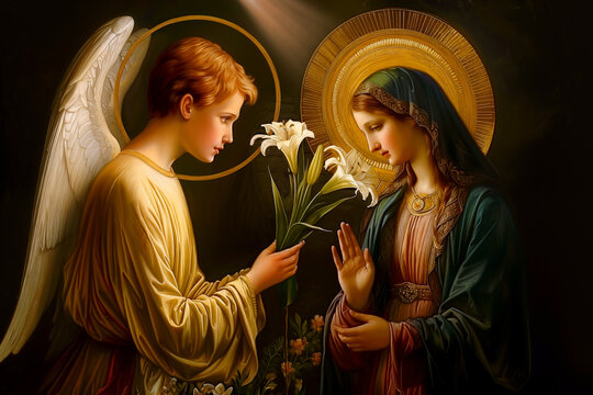 Illustration of the Annunciation of the Blessed Virgin Mary. The archangel Gabriel's greeting to Mary.