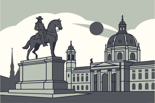Archduke Charles statue guards Vienna’s Heldenplatz as museum domes and evening skies create a stately city scene, modern flat illustration style.