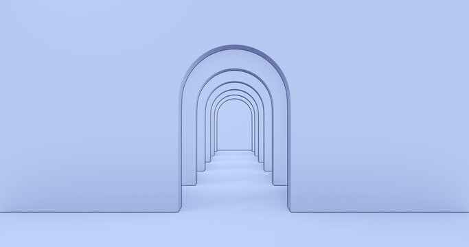 Concept business roads. Blue matte wall. Arch hallway simple geometric background, architectural corridor, portal, and arch columns inside empty walls. Modern minimal concept. 3d rendering.