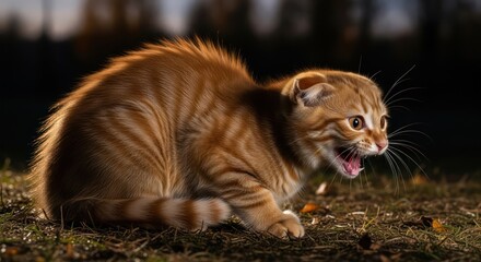 Frightened ginger kitten hissing with arched back on grass against a blurred dark background