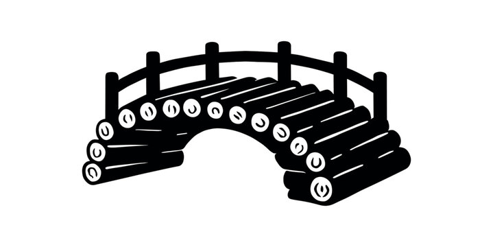 Black and white silhouette of a wooden arched bridge over a calm river surrounded by plants and trees