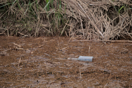 bottiglia di vetro abbandonata, che galleggia sulla superficie di un canale acquatico in campagna. concetti sull'inquinamento ambientale