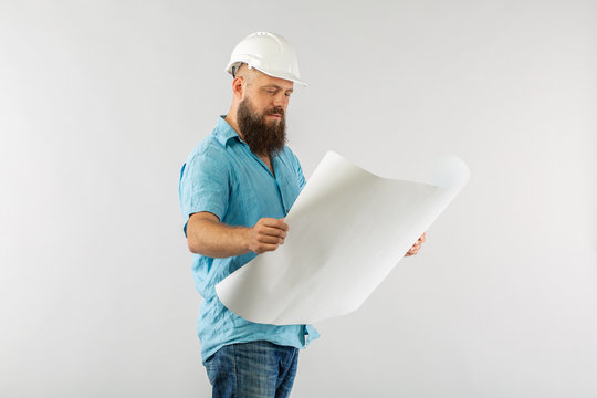 Builder man with roll paper wearing at white helmet. architect considers drawings on whute background