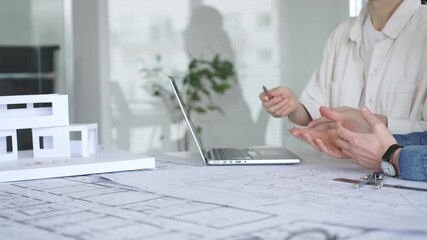 Architects are discussing building plans, using a compass over blueprints while collaborating on a new construction project in an office, emphasizing design, planning, and teamwork, close up