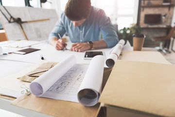 Male hands writing on notepad with part of industrial blueprint with calculator, tools and laptop