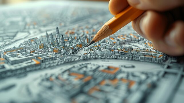 A man is drawing a model of a house with a pencil. The house is tall and has many windows. The man is focused on his drawing, and the scene gives off a sense of creativity and attention to detail