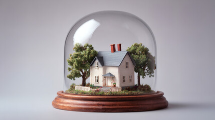 A small house model under a glass dome showcasing detailed architecture