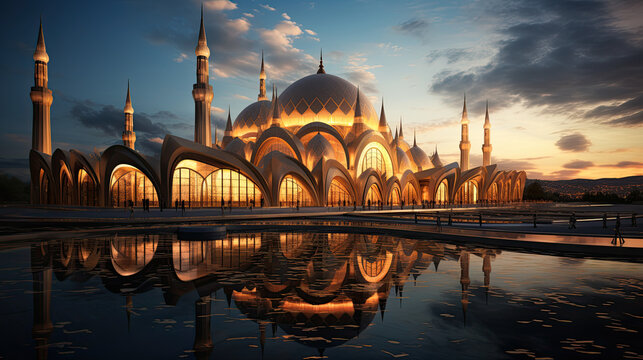 modern architectural silhouette of uzbekistan mosque vibrant colors on dusk sky minimalistic aesthetic