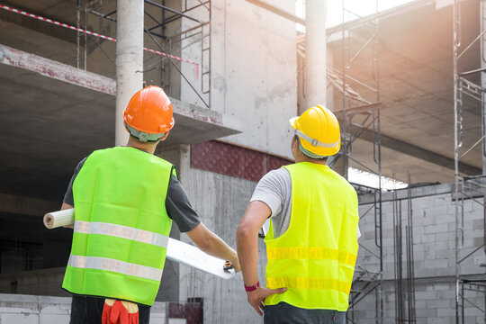 Confident team of architect working together in building construction site. They discussing about new startup project. Architect discuss with engineer about project . Architectural concept.