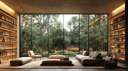 Spacious living room features a contemporary design with ample natural light pouring in from large windows. Cozy seating surrounds shelves filled with books, providing a relaxing atmosphere.