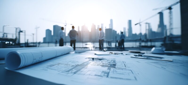Modern Architecture Team Reviewing Blueprints at Construction Site with City Skyline, Focus on Project Planning, Permits, and Government Approval – Professional, Clean, Realistic Scene